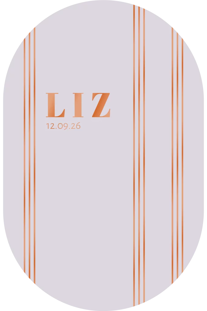 Dit ovalen geboortekaartje met grafische lijnen in bruine oranje kleur UV spotlak en lila paarse achtergrond kun je zelf aanpassen naar wens en smaak.