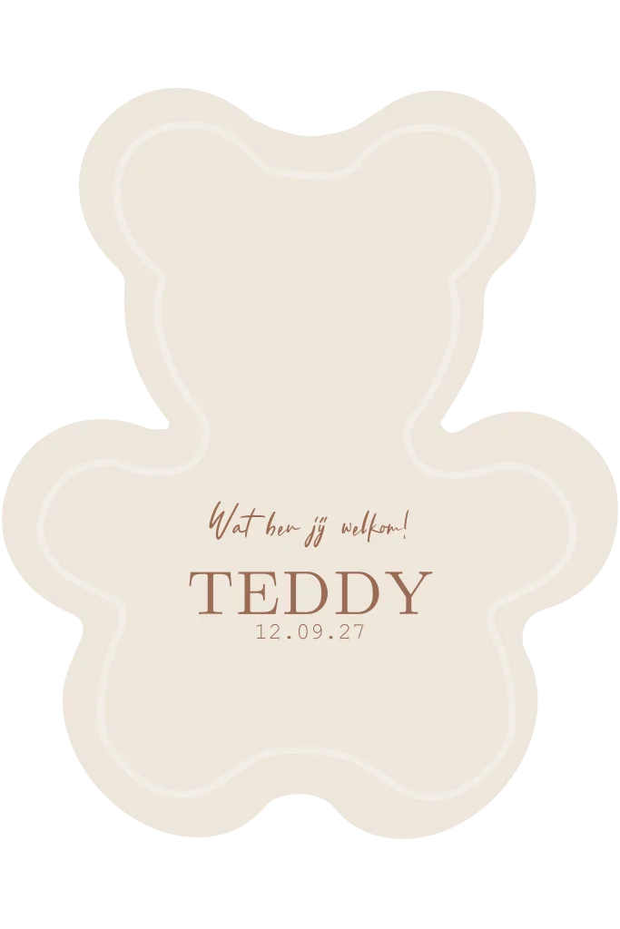 Dit geboortekaartje in de vorm van een beertje kun je zelf aanpassen naar wens. De beige en bruin tinten kun je een andere kleur geven maar ook het lettertype kun je aanpassen.