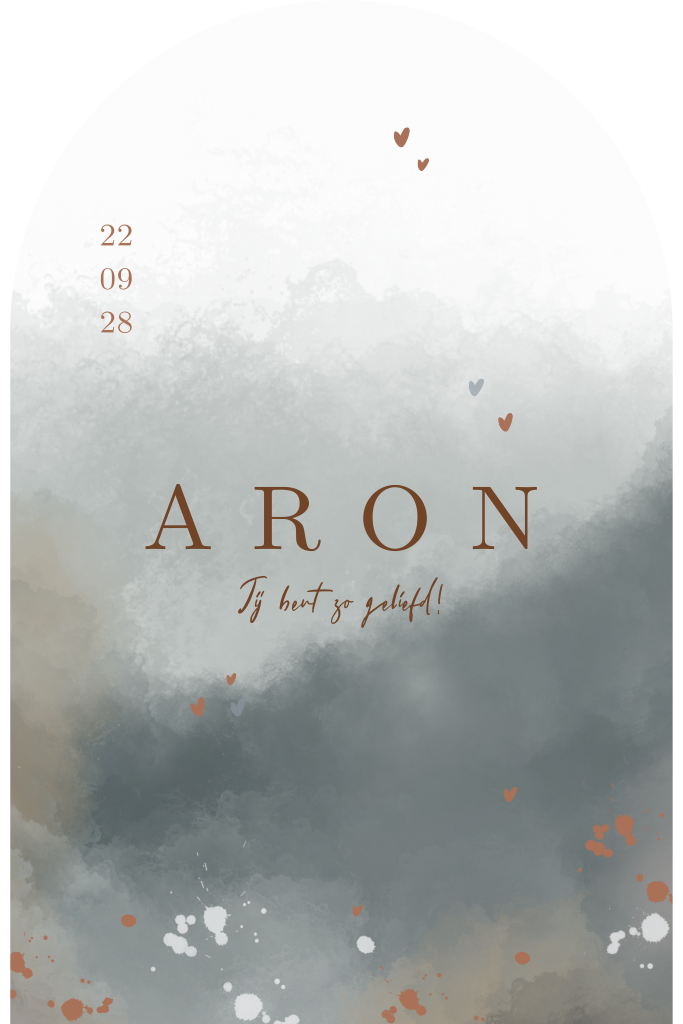 Een stoer geboortekaartje voor een jongen met een blauw grijze watercolour print en spetters in de vorm van een kerkraam.