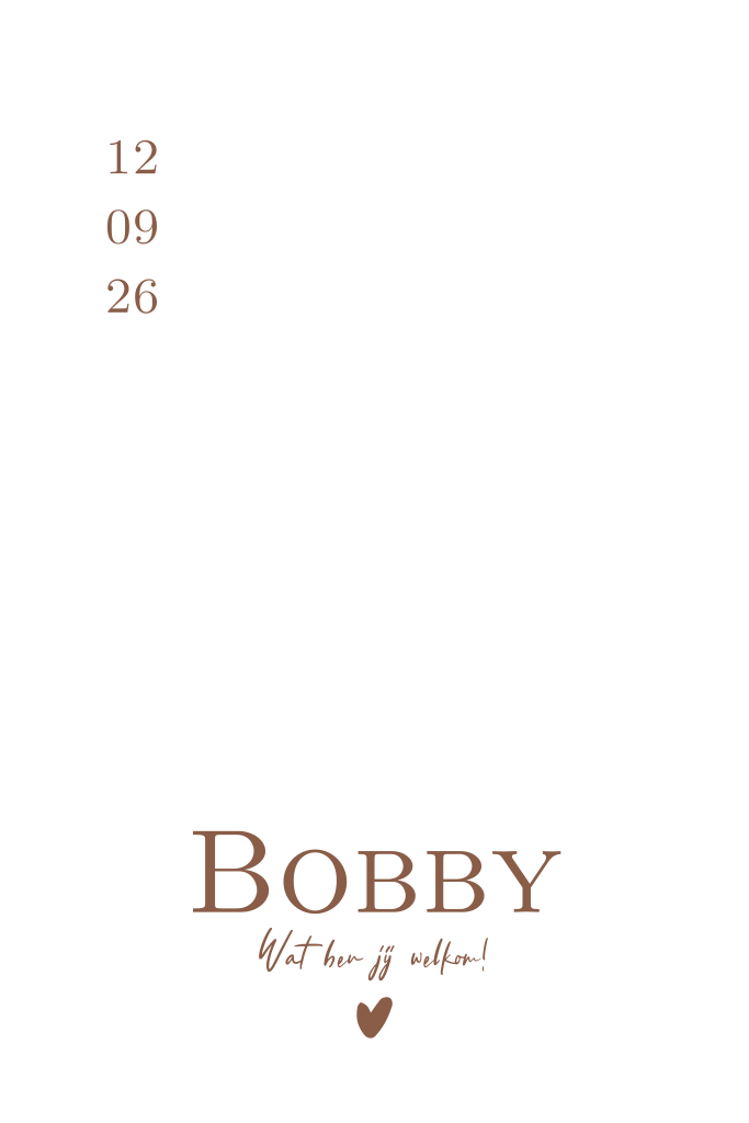 Een lief minimalistisch unisex geboortekaartje met een bijzondere vorm. De witte achtergrond en de roestbruine kleur van het lettertype kun je zelf aanpassen.