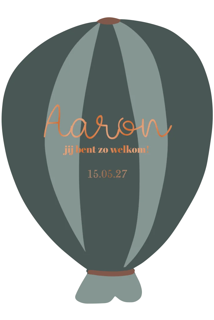 Dit geboortekaartje heeft de vorm van een ballon en de tekst is gedrukt met UV spotlak in koper kleur, maar deze kleur kun je aanpassen naar wens. De groen blauwe kleuren kun je niet aanpassen maar het lettertype en de kleuren van het folie kun je wel omzetten.