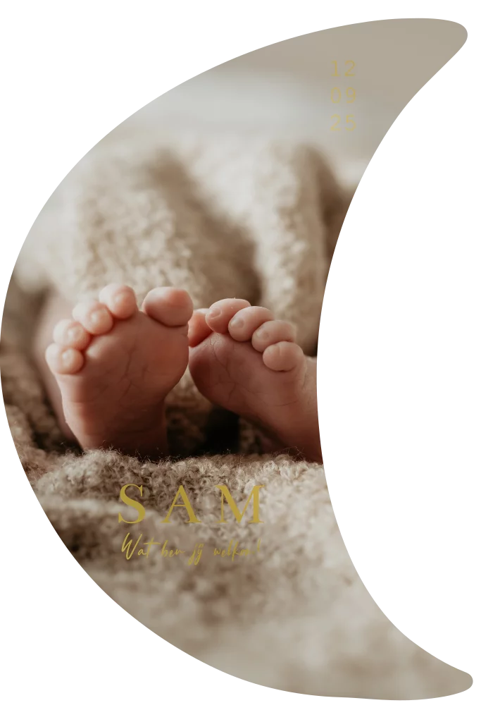 Geboortekaartje maan vorm jongen meisje baby voetjes foliedruk