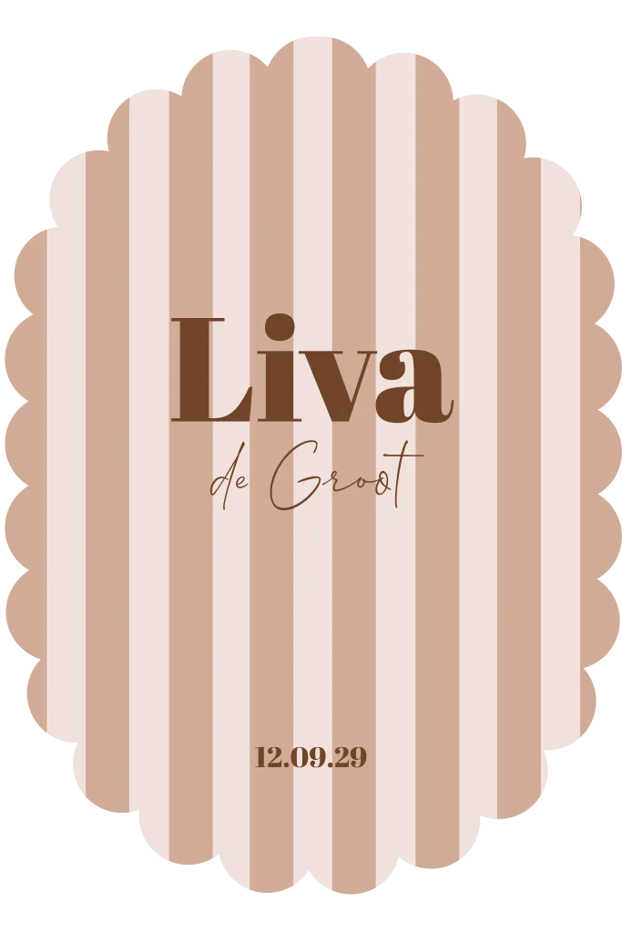 Een lief geboortekaartje in een bijzondere bloemachtige ovalen vorm met roze strepen.