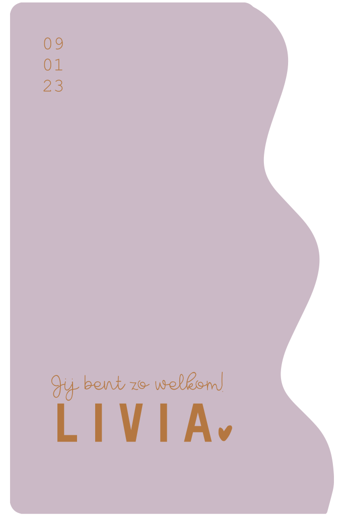 Een uniek geboortekaartje voor een meisje in een hele bijzondere vorm met lila paars en oranje bruine kleuren. Livia