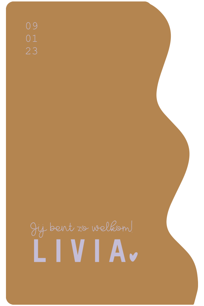 Een uniek geboortekaartje voor een meisje met een bijzondere vorm in oranje en lila kleuren.