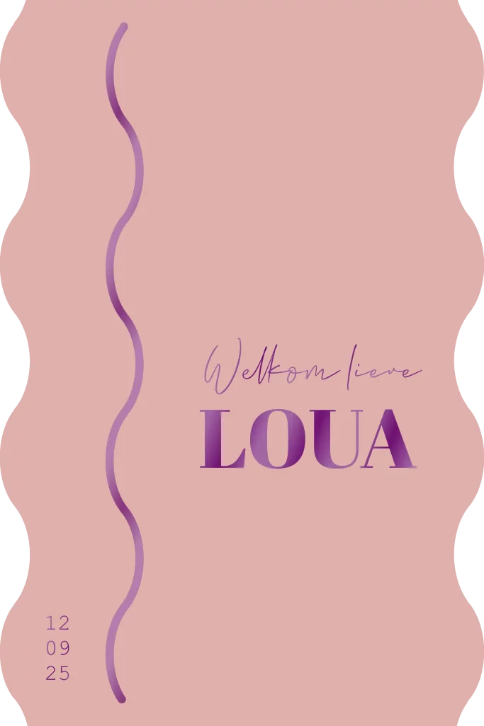 Dit geboortekaartje met golfjes roze achtergrond en paarse aubergine kleurige tekst in UV spotlak kun je aanpassen naar wens en smaak. Loua Loua