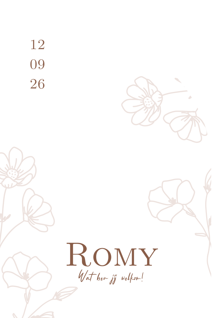 Dit lieve geboortekaartje met de vorm van een halve boog kun je aanpassen. De lijntekeningen van de bloemen in roze en de bruintinten kun je een andere kleur geven. Ook kun je het lettertype aanpassen.