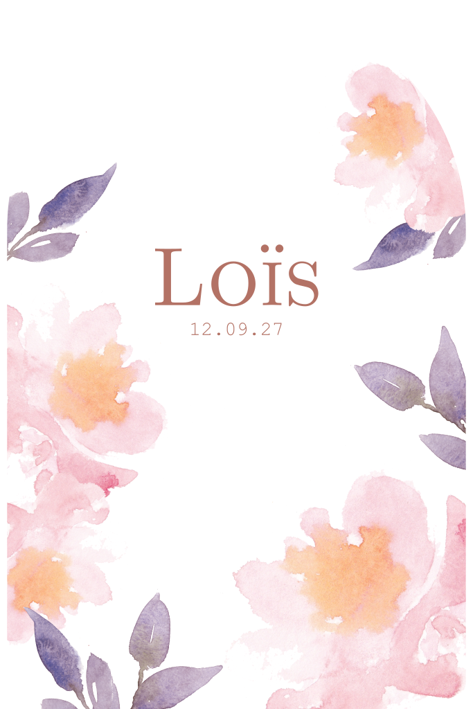 Dit lieve geboortekaartje voor een meisje met roze en paarse watercolour bloemen heeft de vorm van een kerkraam. Je kunt dit kaartje zelf aanpassen naar wens. zo verstuur je straks unieke geboortekaartjes voor jullie dochtertje.