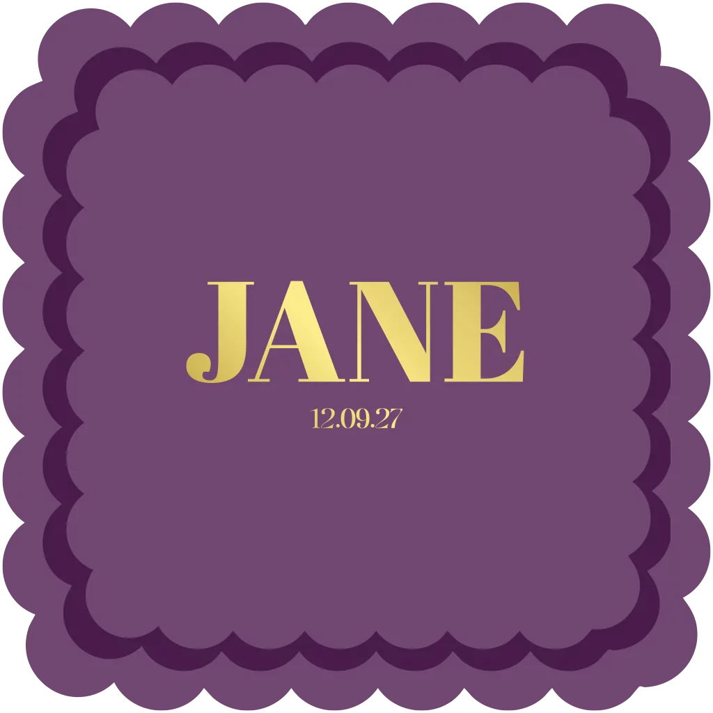 Een lief geboortekaartje voor een meisje in de vorm van een koekje in lila en aubergine kleuren.