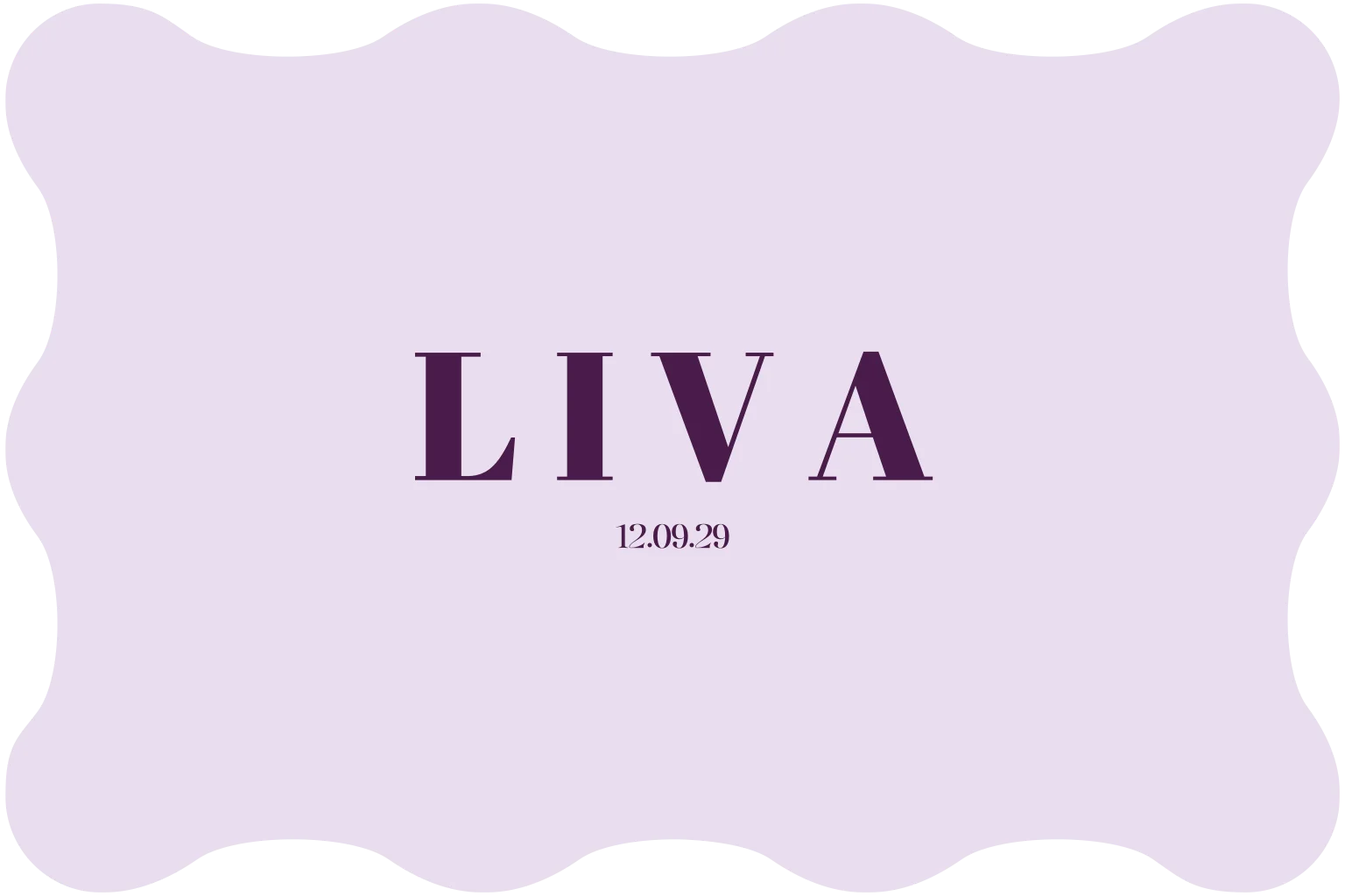 Geboortekaartje meisje met lila paarse kleur met golvende organische vormen. De kleuren en lettertype kun je allemaal aanpassen. Liva