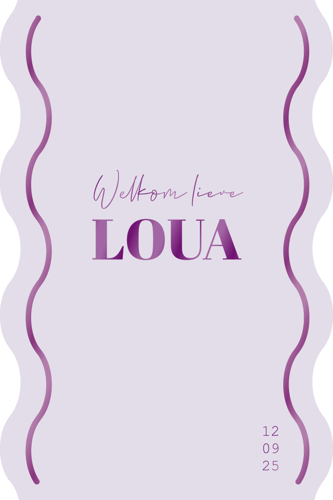 Dit geboortekaartje met golfjes en lila paarse achtergrond kun je zelf aanpassen naar wens en smaak. Loua