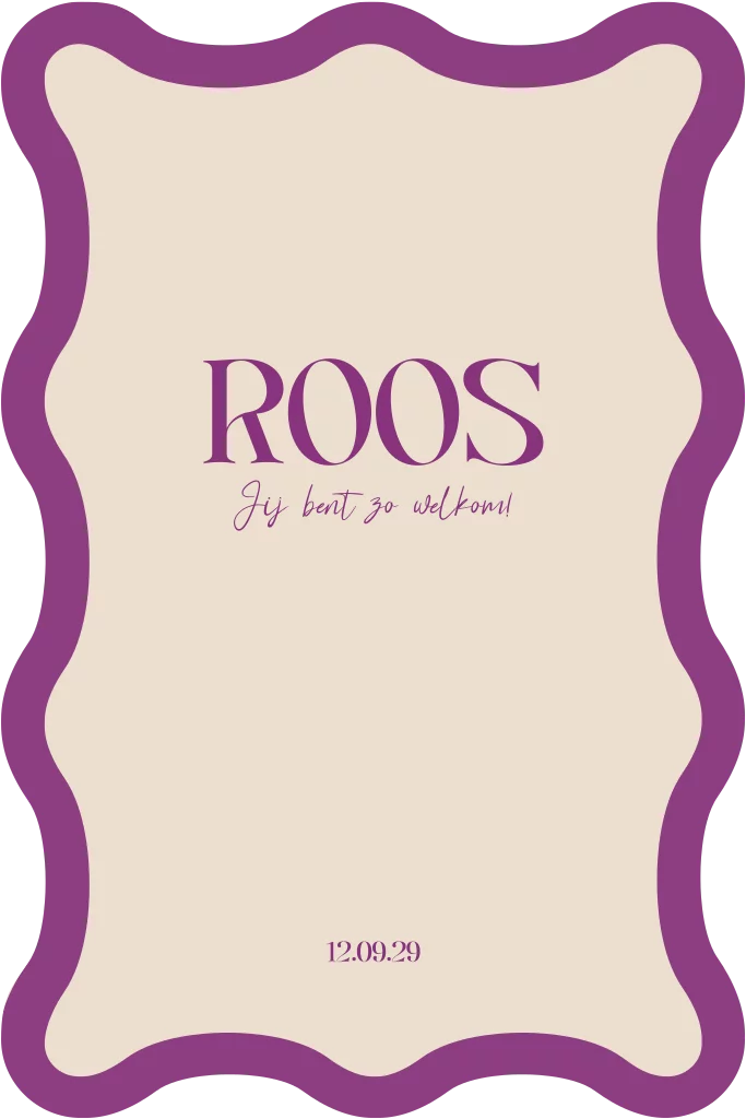 Dit geboortekaartje voor een meisje met organische golven vorm en rand in paars en zalm beige achtergrond kun je zelf aanpassen naar wens. Roos