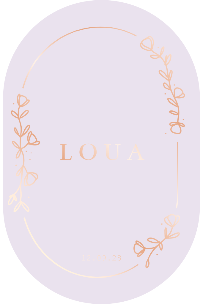 Dit ovalen geboortekaartje met bloemen in rose folie en lila paarse achtergrond kun je zelf aanpassen naar wens. Loua