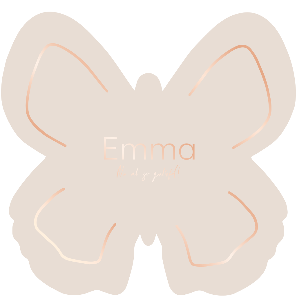 Dit geboortekaartje in de stansvorm van een vlinder in roze kleur met roséfolie kun je zelf helemaal aanpassen naar wens. Emma