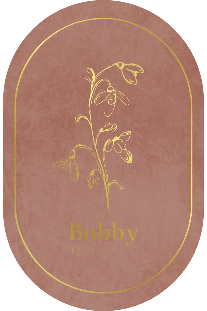 Dit ovalen geboortekaartje met de geboortebloem van januari het sneeuwklokje in goudfolie kun je zelf aanpassen naar wen en smaak.