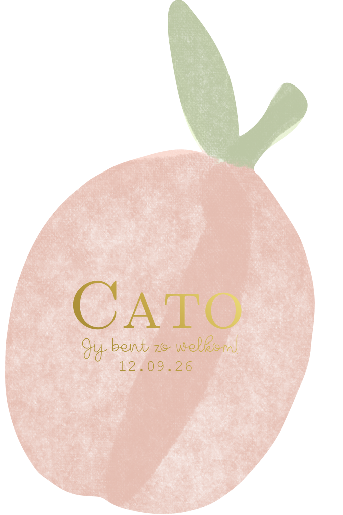 Geboortekaartje in perzik vorm en goudfolie druk op de voorkant. Dit kaartje kun je zelf aanpassen naar wens. Cato