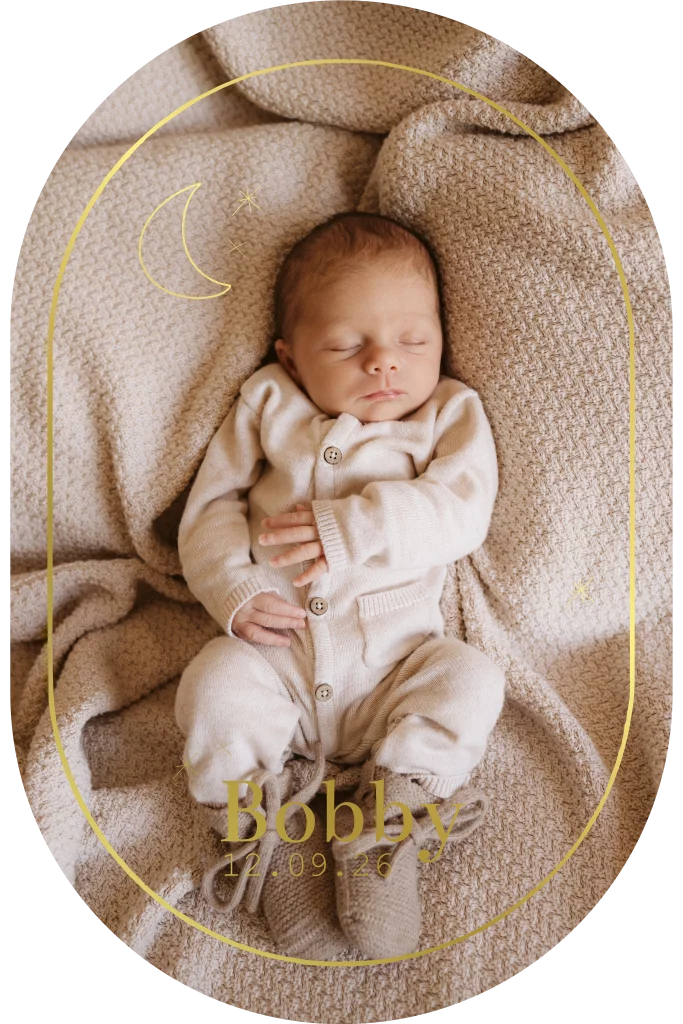 Dit geboortekaartje kan voor zowel een jongen als een meisje. De ovalen stansvorm geeft het kaartje en unieke uitstraling in combinatie met het goudfolie en natuurlijk het maantje en de sterretjes.