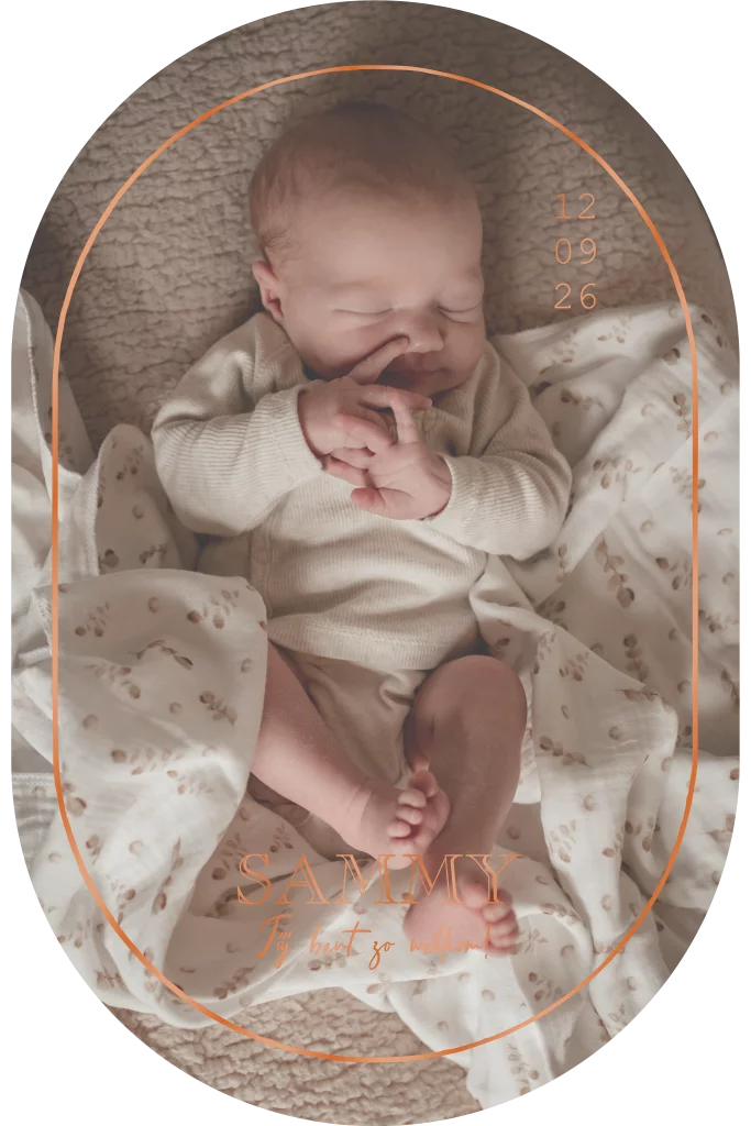 Dit lieve geboortekaartje met een newborn foto gemaakt door fotograaf Anne van Gils kun je zelf aanpassen naar wens door een foto van jullie newborn baby toe te voegen. Ook kun je de koperleurige UV spotlak omzetten in een andere kleur en het letterype aanpassen.