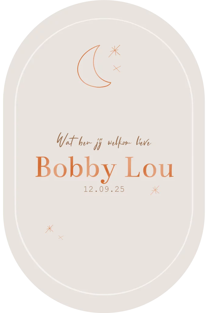 Dit stans geboortekaartje in ovalen vorm kun je zelf aanpassen naar wens. De koper kleurige UV spotlak maar ook het lettertype en de maan en sterretjes.