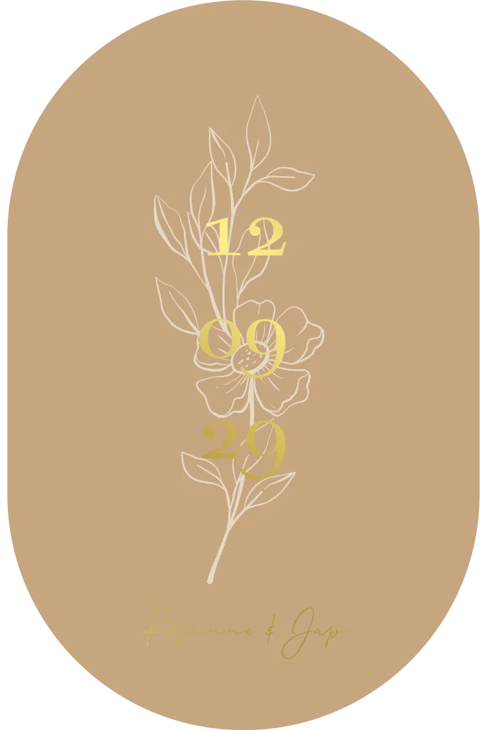 Deze ovalen Save the date kaart met oranje achtergrond en bloemen tak met goudfolie kun je zelf aanpassen naar wens.