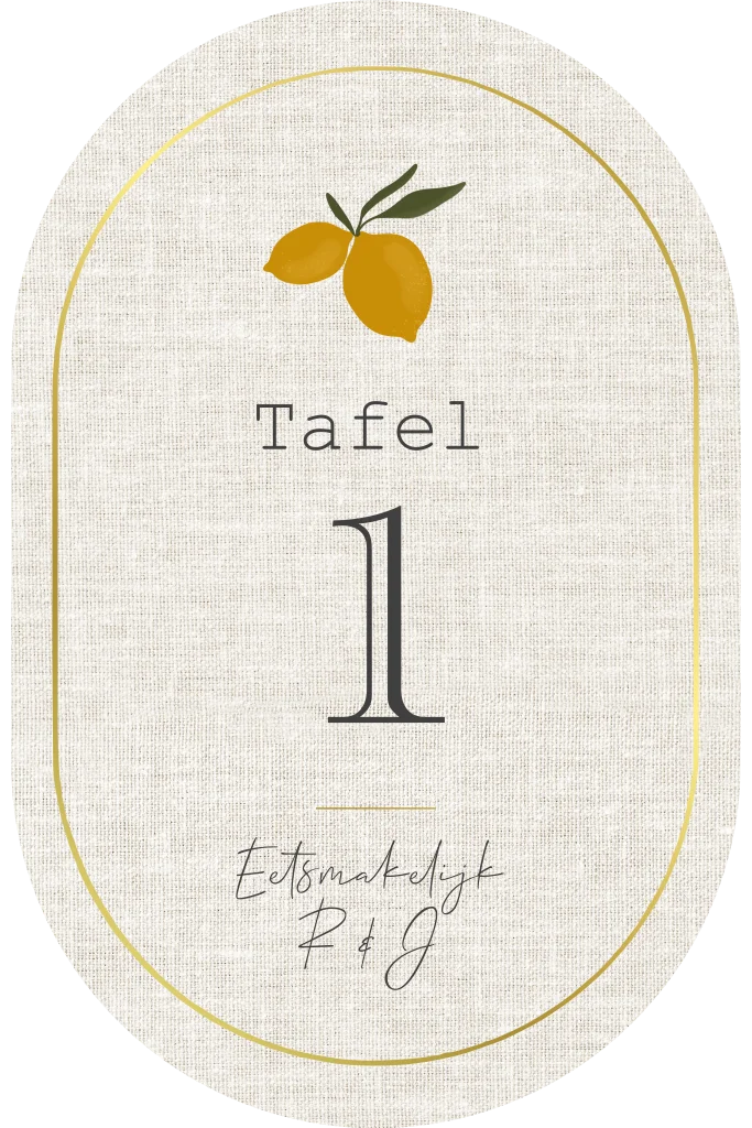 Ovalen tafelnummer met citroentje en linnen look met goudfolie