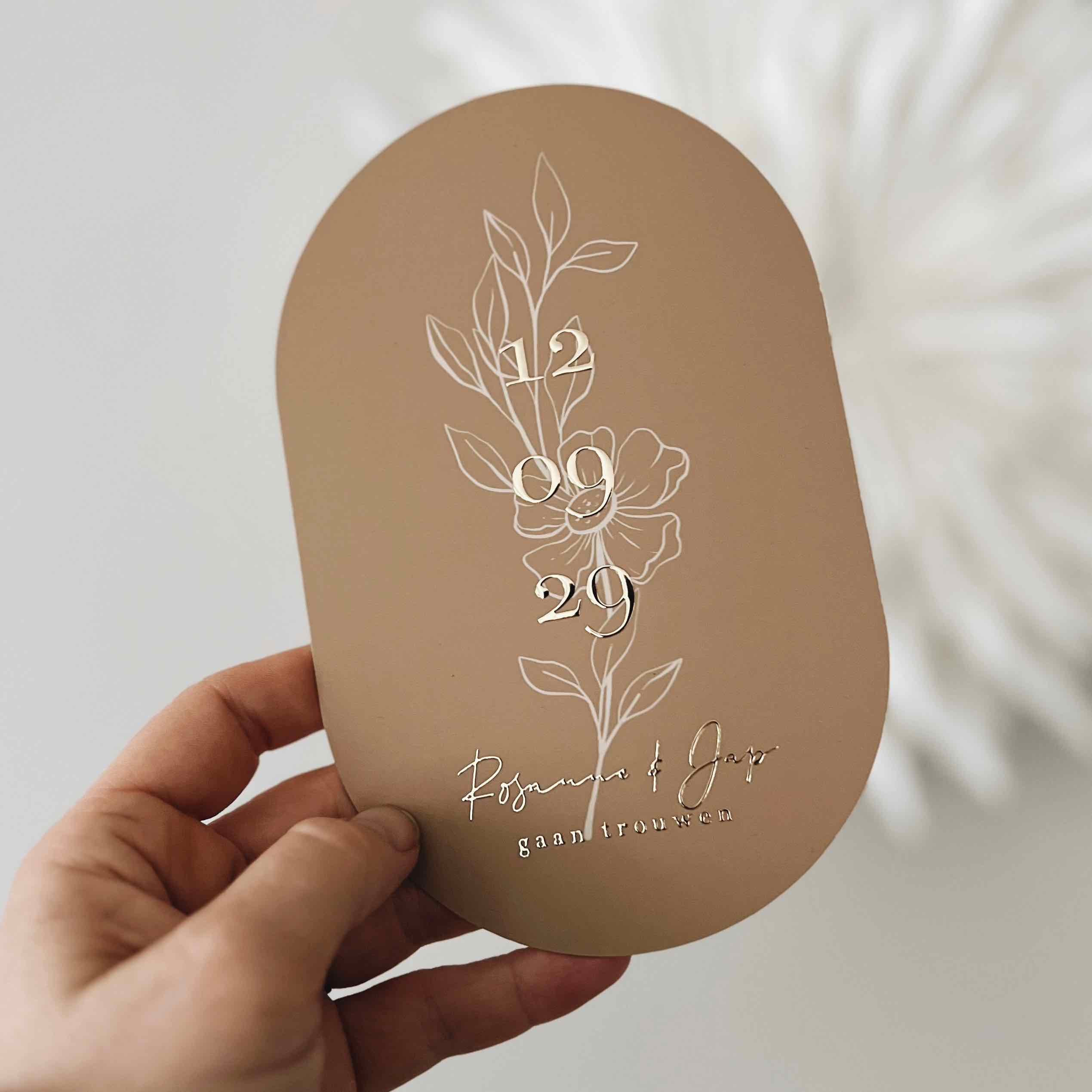 Deze ovalen trouwkaart met bloemen op de achtergrond en de datum in folie op de voorgrond kun je zelf aanpassen naar wens en smaak. Rosanne en Jaap