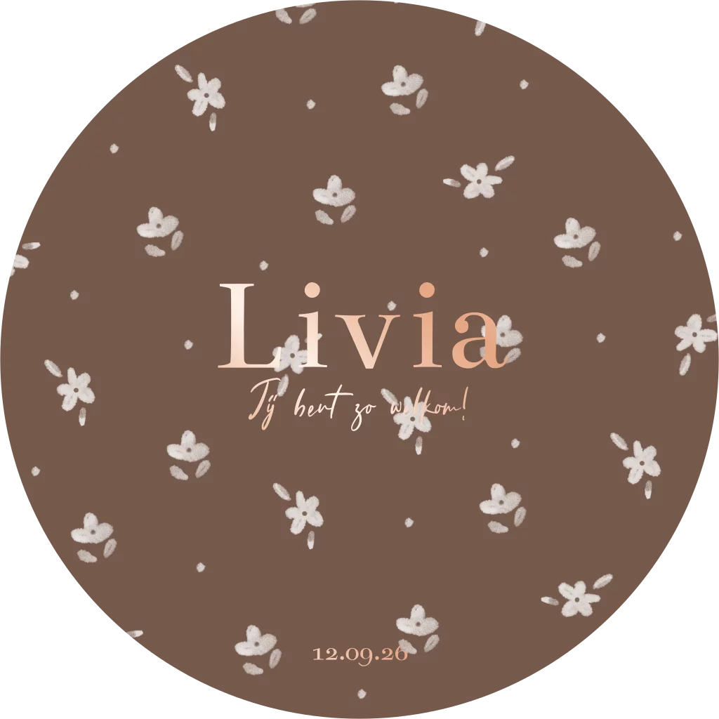 Een lief rond geboortekaartje met bloemenprint bruin met witte kleine bloemetjes en roséfolie. Livia