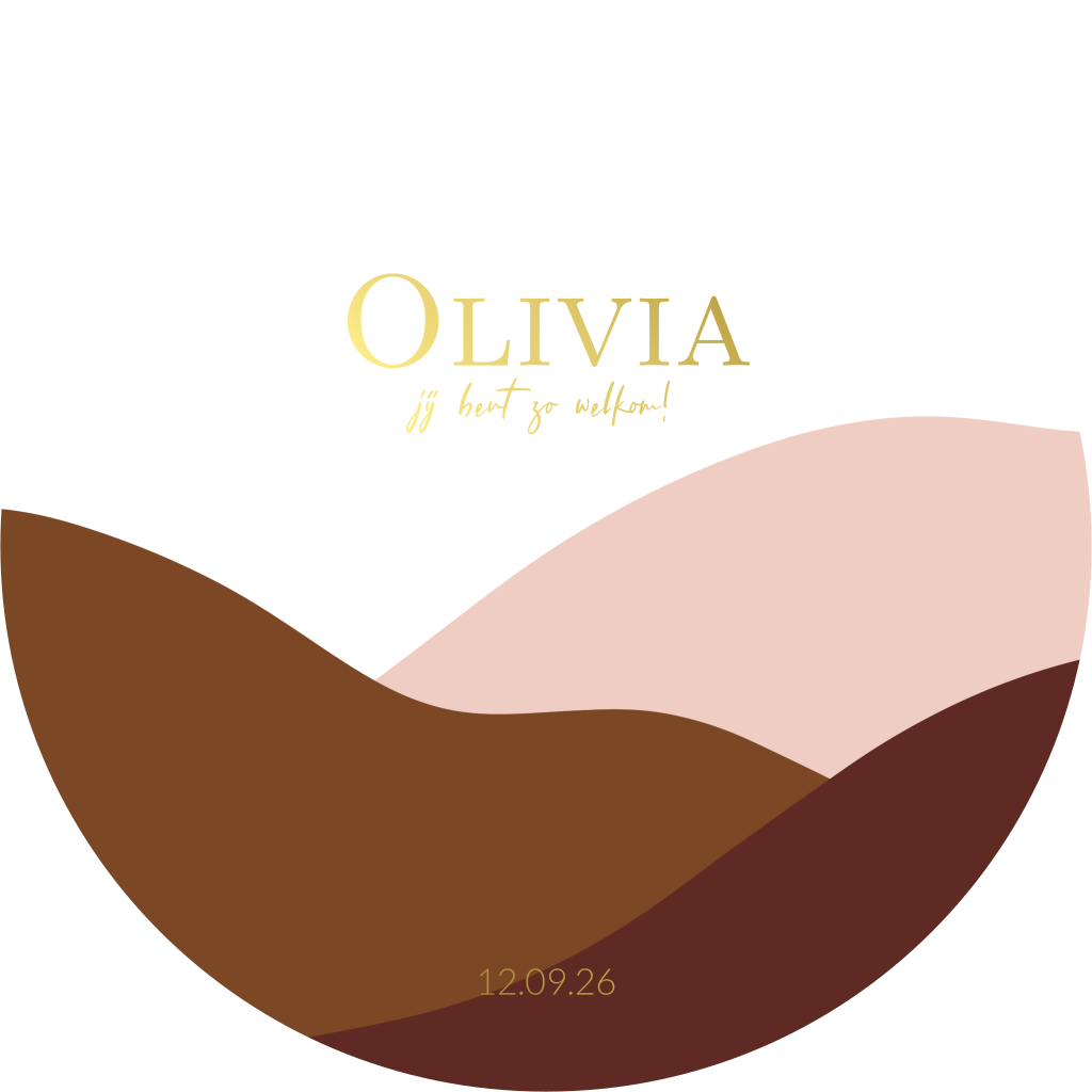 Een retro rond geboortekaartje voor een meisje met vrolijke felle kleuren roze, oranje en bruin. Prachtig in combinatie met de goudfolie druk. Olivia
