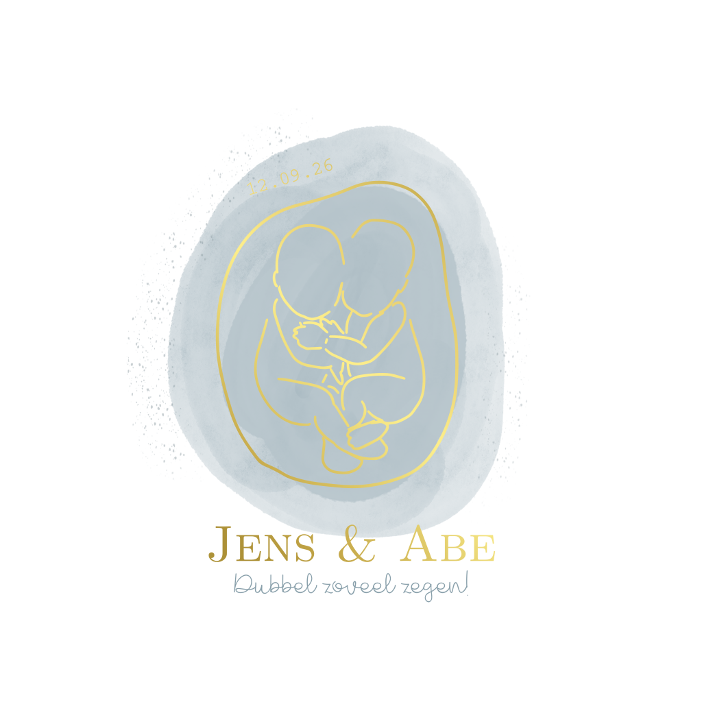 Rond geboortekaartje tweeling lijntekening zwarte goudfolie blauw