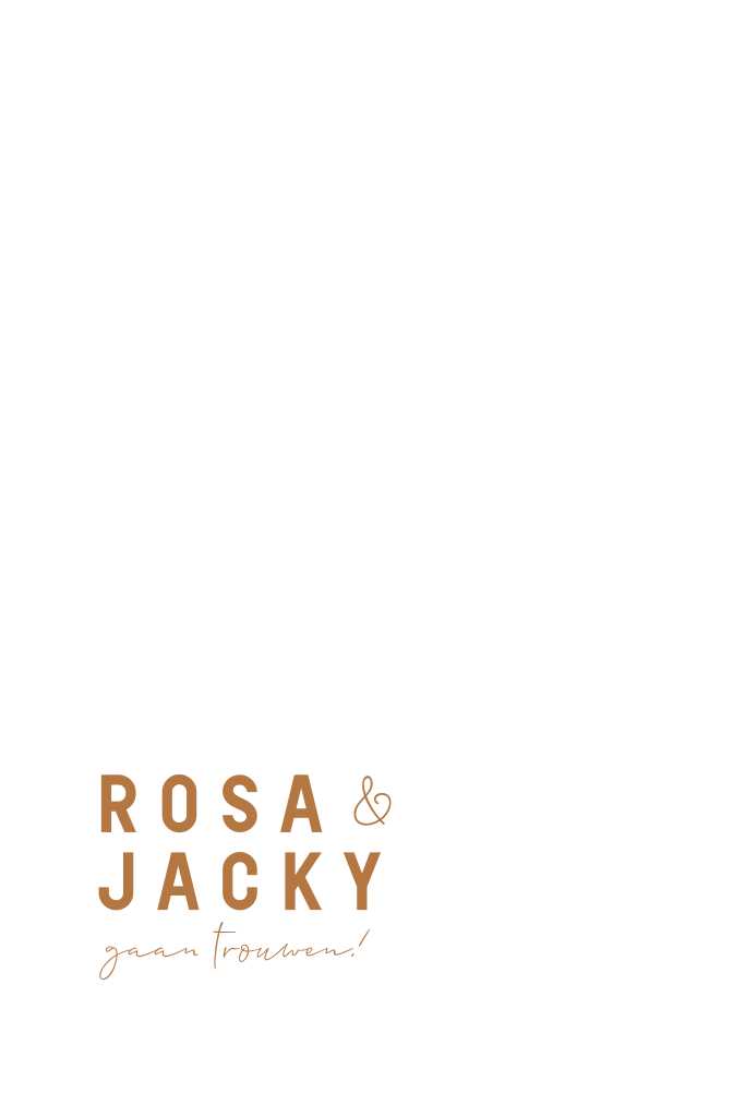 Trouwkaart met bijzondere vorm met geronde gekartelde rand. Wit met oranje bruin. Je kunt het lettertype en de kleuren aanpassen Rosa en Jacky