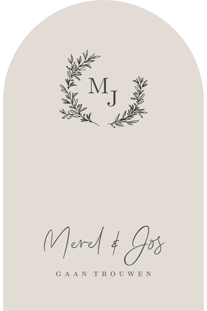 Deze minimalistische trouwkaart met een krans met initialen kun je aanpassen naar wens. De beige kleuren maar ook het lettertype.