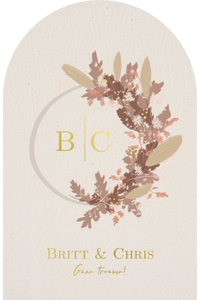 Deze trouwkaart in de vorm van een kerkraam met kraft achtergrond en krans van droogbloemen kun je zelf aanpassen naar wens voor jullie bruiloft.
