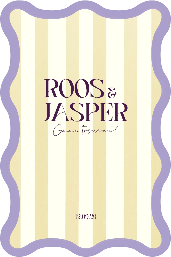 Deze trouwkaart met zomerse gele streepjes kun je zelf aanpassen naar wens. Ook de lila en paarse kleuren.