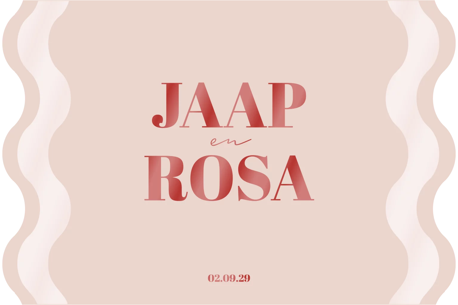 Een unieke trouwkaart met golvende zijkant met een roze achtergrond en de naam in fel rood in UV spotlak