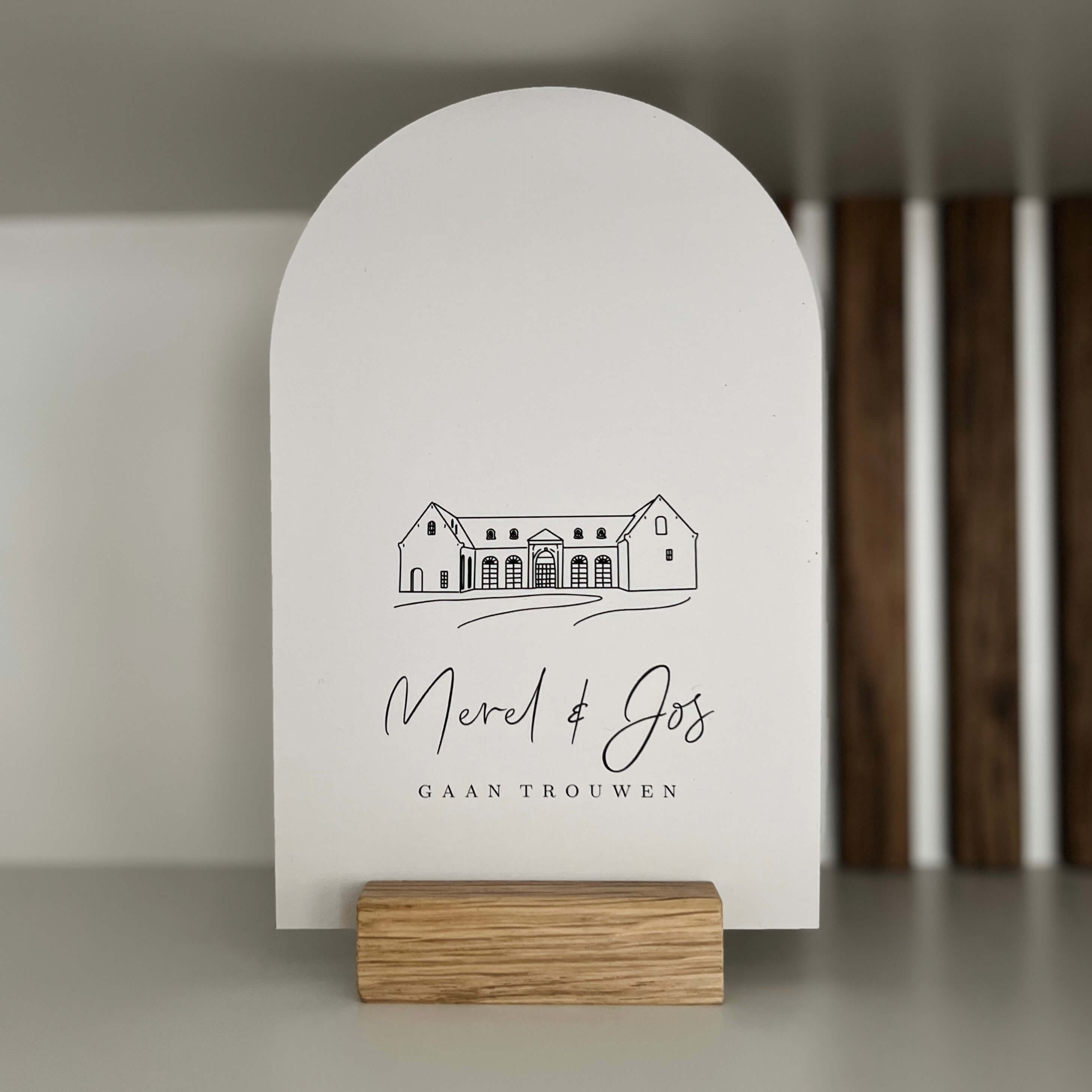Deze minimalistische trouwkaart in boogvorm met de lijntekening van de trouwlocatie van Molen de zwaluw kunnen we natuurlijk op maat maken voor je. Je mag ons mailen voor de mogelijkheden.