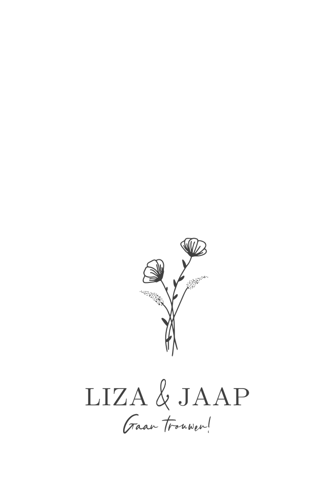 Een minimalistische trouwkaart zwart wit met een boeketje bloemen in de vorm van een kerkraam.