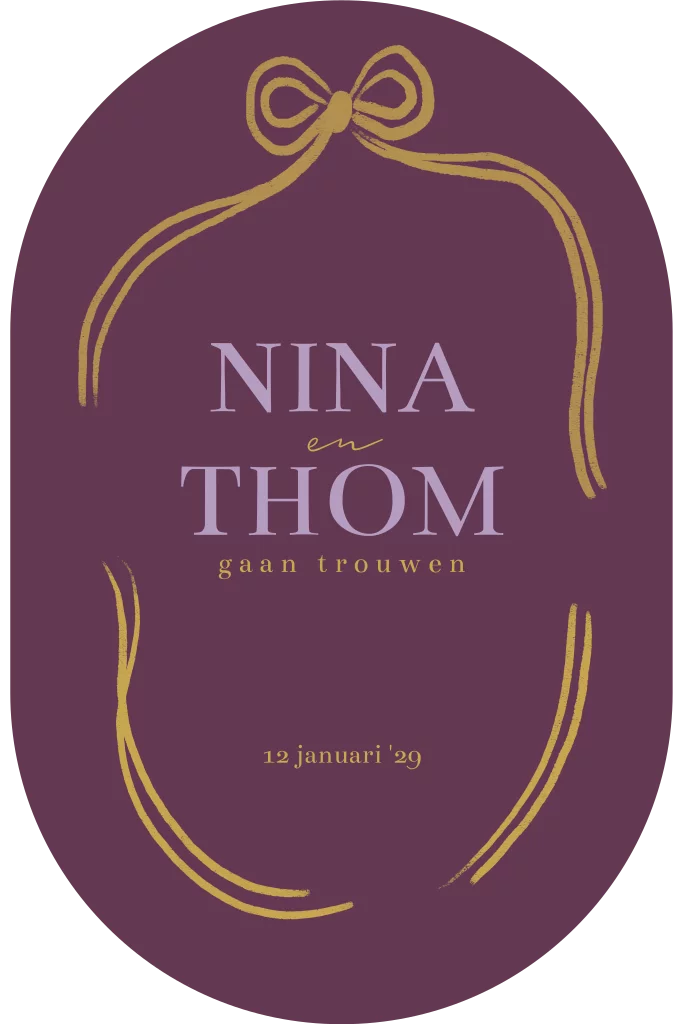 Deze ovalen trouwkaart met een nonchalant hangend strikje in oker gele kleuren met paars aubergine en tekst in lila kleur. Nina & Thom
