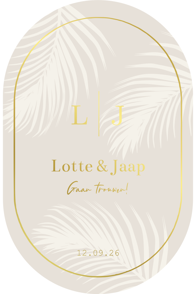 Deze trouwkaart met takken van een palmboom in ovalen vorm kun je zelf aanpassen naar wens. De beige kleur maar ook het goudfolie.