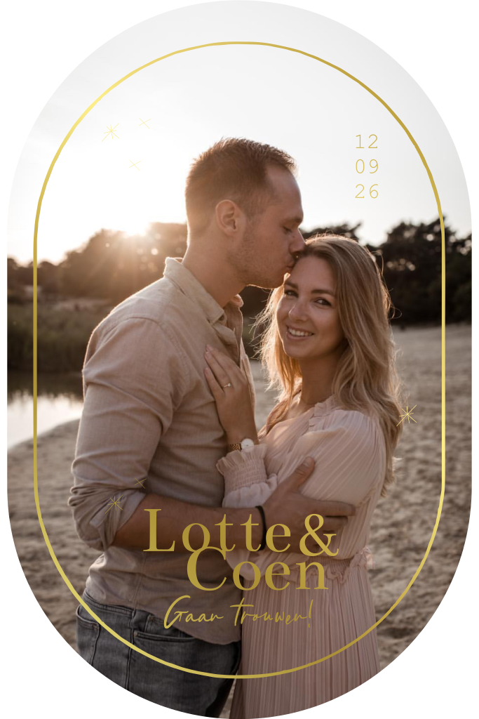 Trouwkaart ovalen vorm met goudfolie rand en sterren met foto