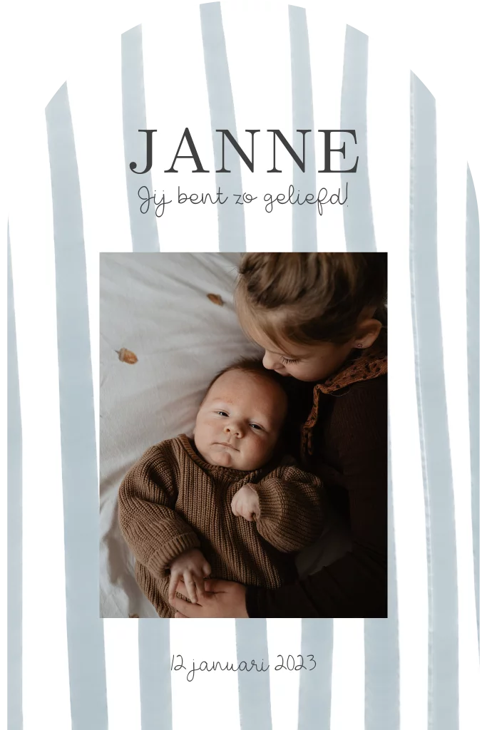 Dit klassieke geboortekaartje met lichtblauwe strepen is perfect voor de aankondiging van de geboorte van jullie zoontje. De stijlvolle strepen geven het kaartje een tijdloze uitstraling en kunnen naar wens worden aangepast. De prachtige foto van het broertje met grote zus, gemaakt door the-storyteller.nl, voegt een persoonlijk tintje toe aan het kaartje. Maar maak je geen zorgen, deze foto kan eenvoudig vervangen worden door een liefdevolle foto van jullie eigen kindje(s). Met dit geboortekaartje kunnen jullie de komst van jullie zoon op een unieke en originele manier aankondigen. De combinatie van de klassieke blauwe strepen en de persoonlijke foto maakt dit kaartje perfect voor de geboorte van jullie kleine man. De toevoeging van hartje en kader details geven het kaartje een moderne touch, terwijl de grijze accenten zorgen voor een stoere uitstraling. Dit geboortekaartje is anders dan de standaard ontwerpen en zal zeker de aandacht trekken. Met de toevoeging van tags zoals 'blauw', 'jongen', 'met-foto' en 'stoer', zal dit kaartje zeker opvallen tussen de rest. Kies voor dit originele geboortekaartje en maak de aankondiging van jullie zoon's komst onvergetelijk. Met dit geboortekaartje jongen klassiek blauwe strepen en foto met grote zus, geef je een persoonlijke en unieke touch aan de aankondiging van jullie zoontje. Laat jullie liefde stralen met dit prachtige geboortekaartje.
