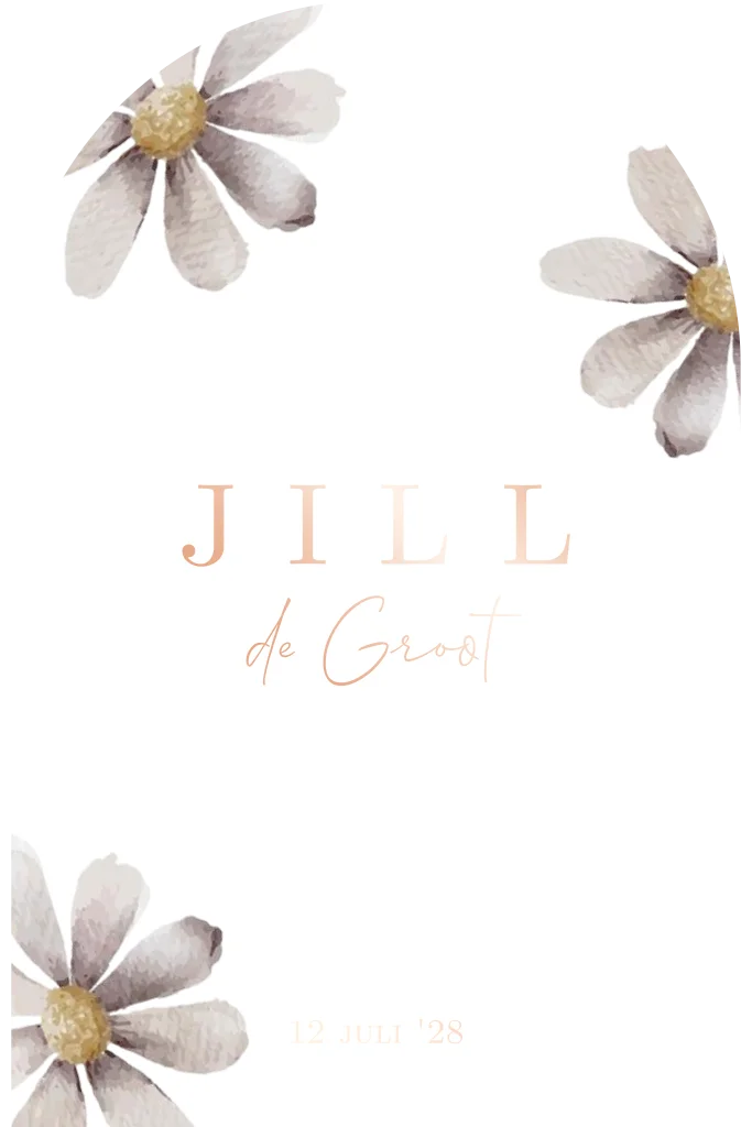 geboortekaartje meisje met geschilderde paarse bloemen en rosefolie