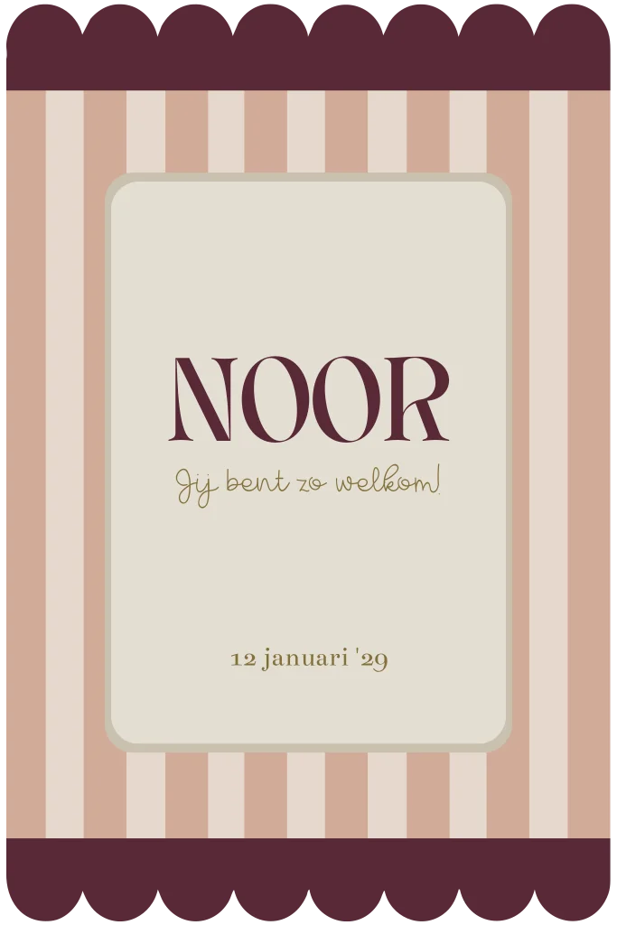 Dit lieve en originele geboortekaartje met golvende rand in paars en roze kun je zelf aanpassen naar wens smaak. Noor
