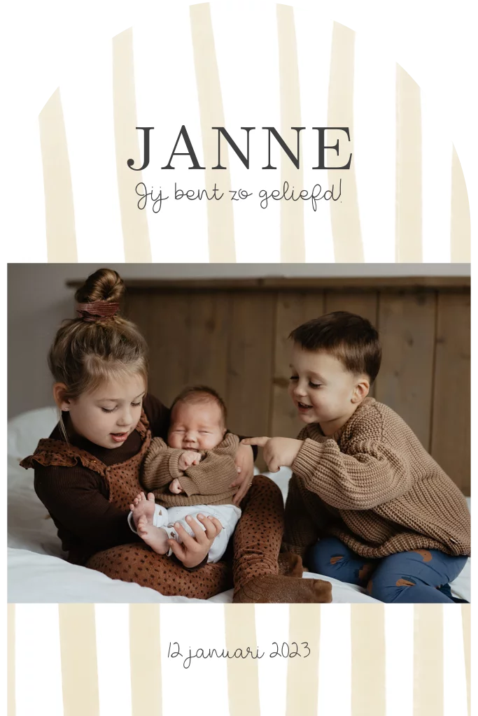 Een lief geboortekaartje voor een jongen of meisje met gele beige strepen erop. Deze kun je een andere kleur geven.