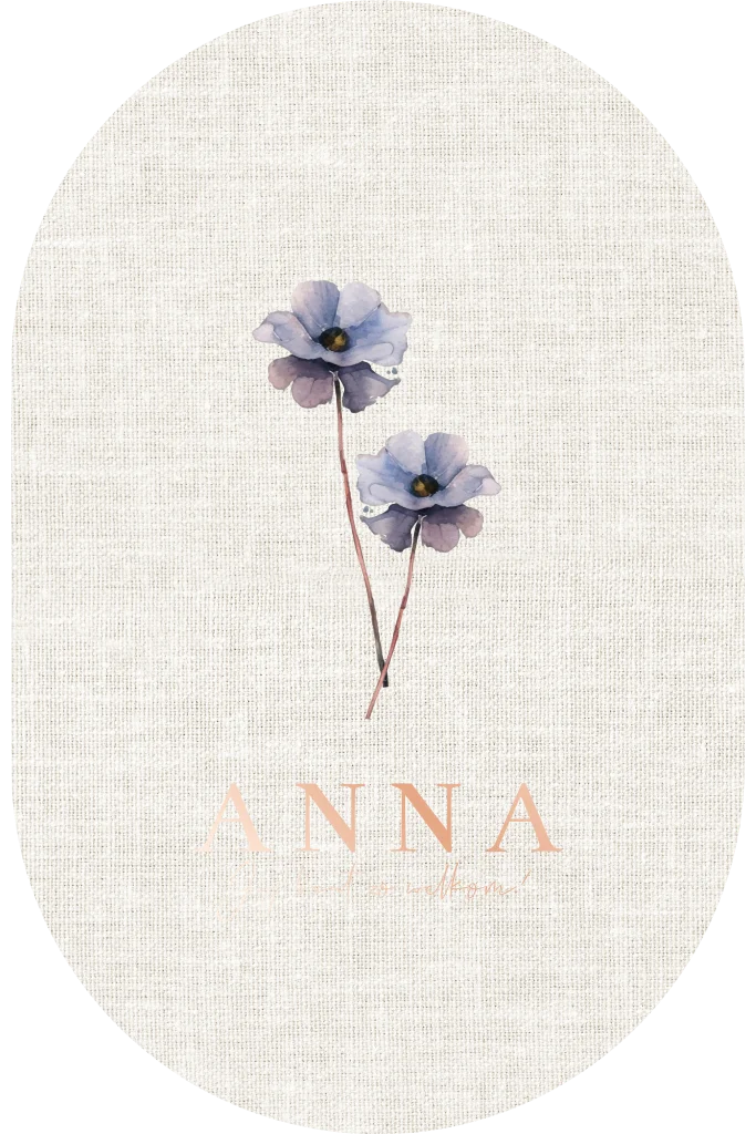 Geboortekaartje met Linnen achtergrond in ovalen vorm met naam in rosé folie of goudfolie en paarse watercolour bloem voorop.