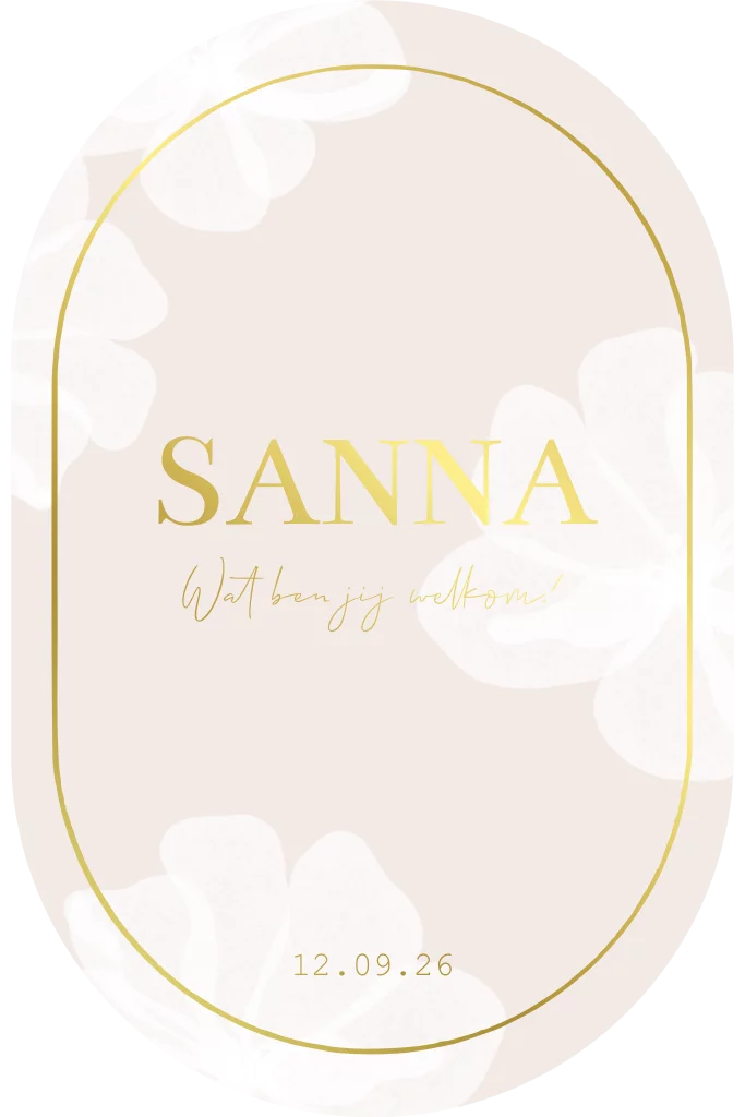 Dit ovalen geboortekaartje voor een meisje met witte geschilderde bloemen en roze achtergrond in combinatie met goudfolie kun je zelf aanpassen naar wens.