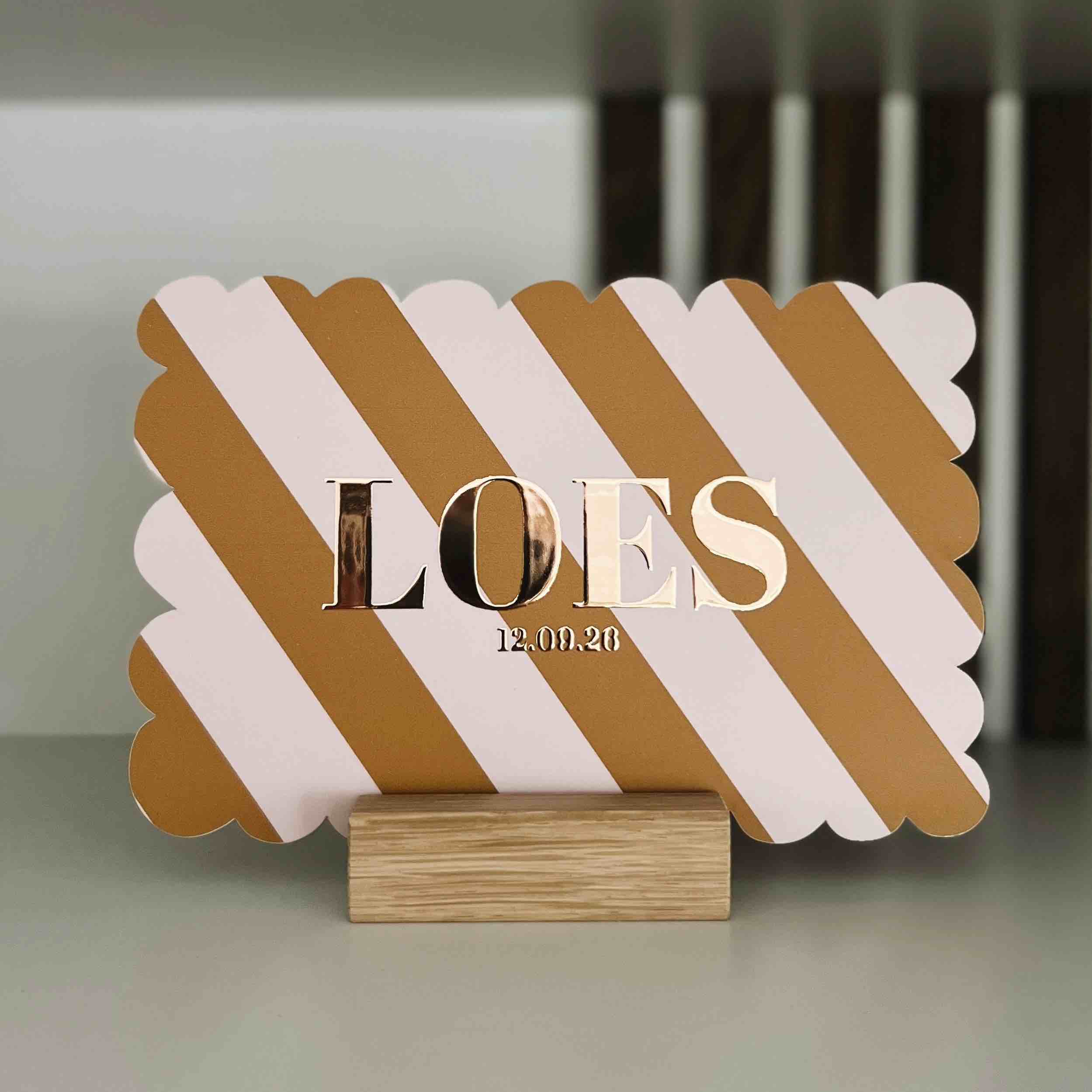 Een lief geboortekaartje met oranje roze schuine strepen en naam in roséfolie met golvende randjes. Alle kleuren kun je aanpassen. Loes