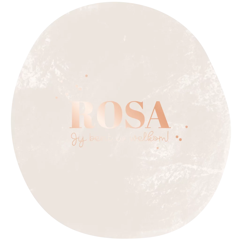 Een lief geboortekaartje voor een meisje in een organische vorm met de naam in rosefolie en de stipjes ook. De beige achtergrond en de rosefolie druk kun je aanpassen naar wens.