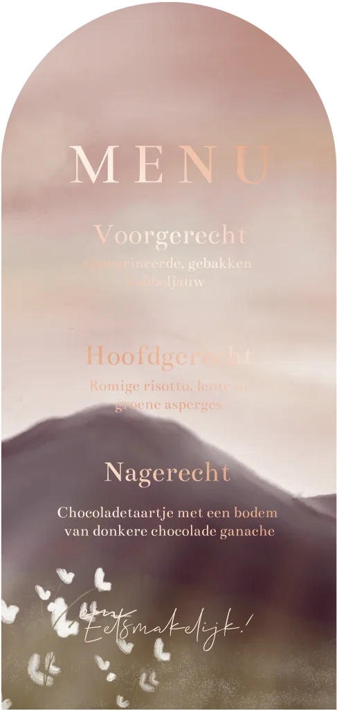 Maak je diner tafel af met deze mooie menukaart met tekening van de bergen in paarse en roze kleuren met zonsopkomst is getekend door Liefwoord.