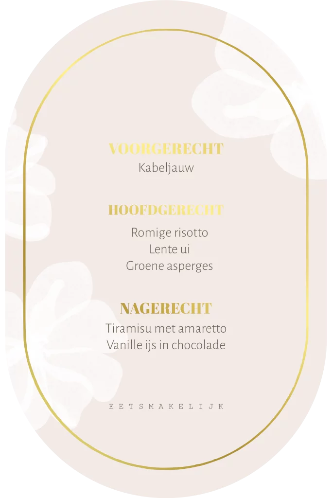 Menukaart ovalen vorm met witte bloemen roze en goudfolie