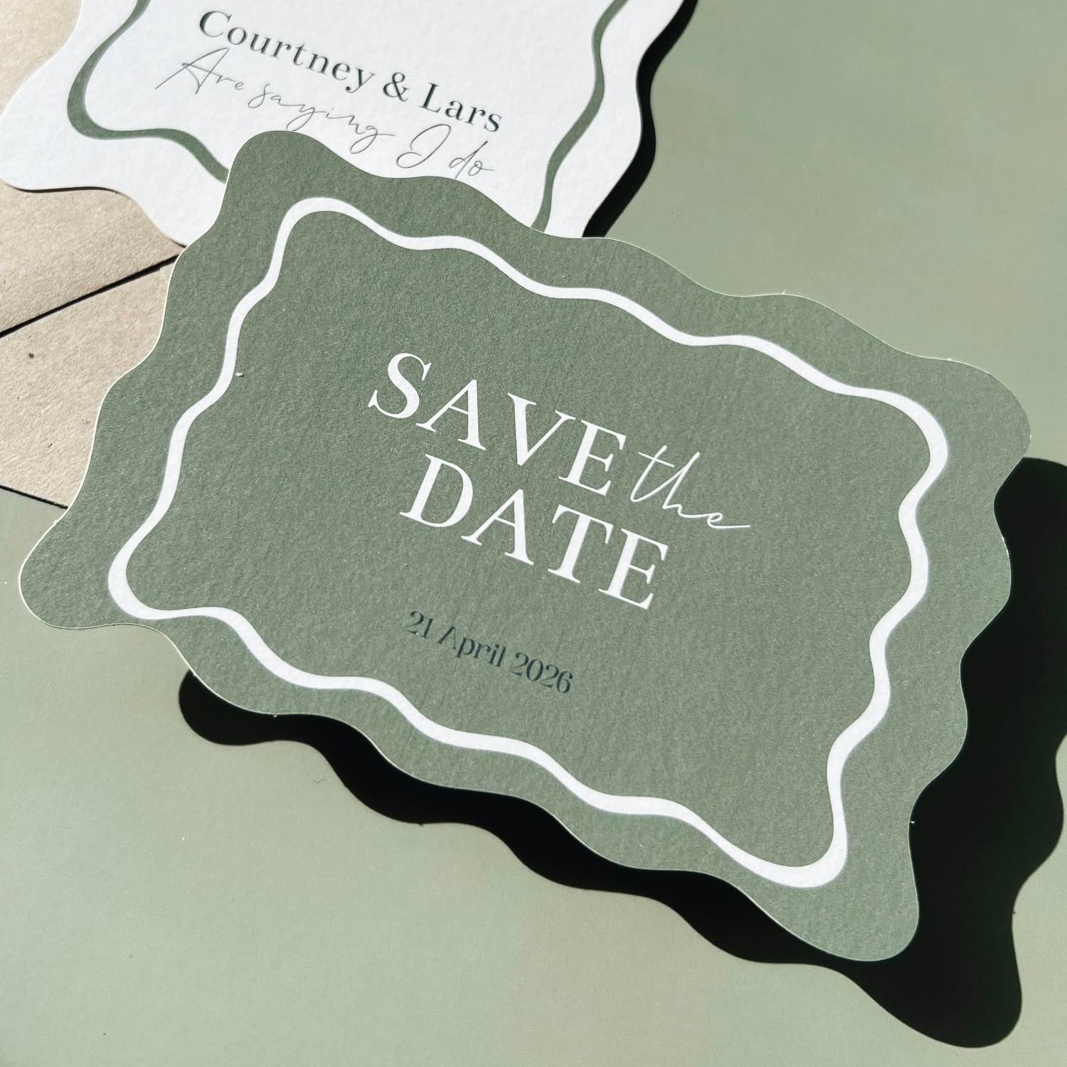 Een Save the date kaart met golvende rand in groene kleur kun je aanpassen naar smaak.